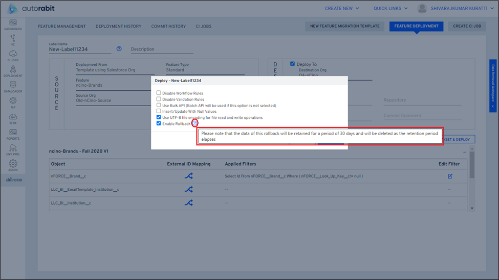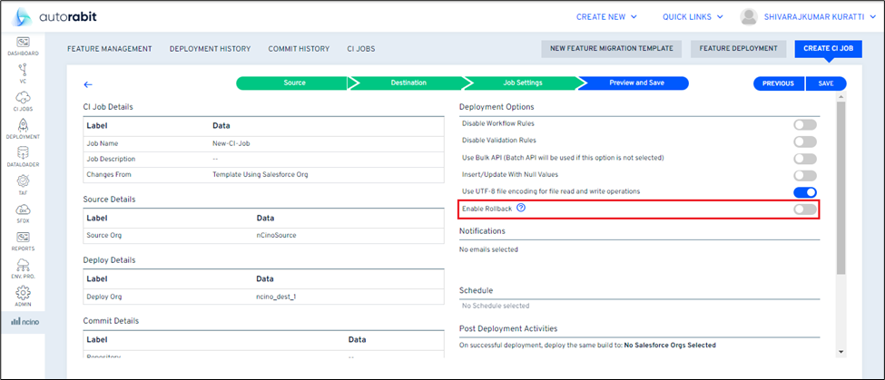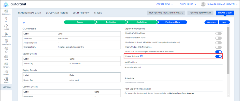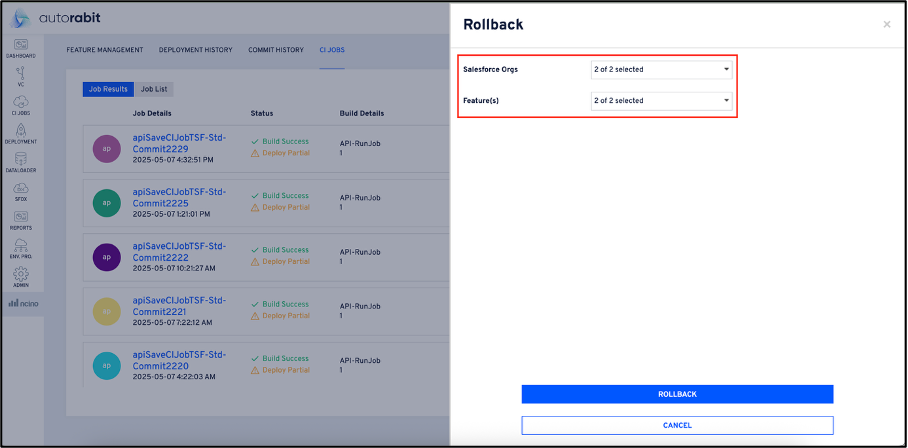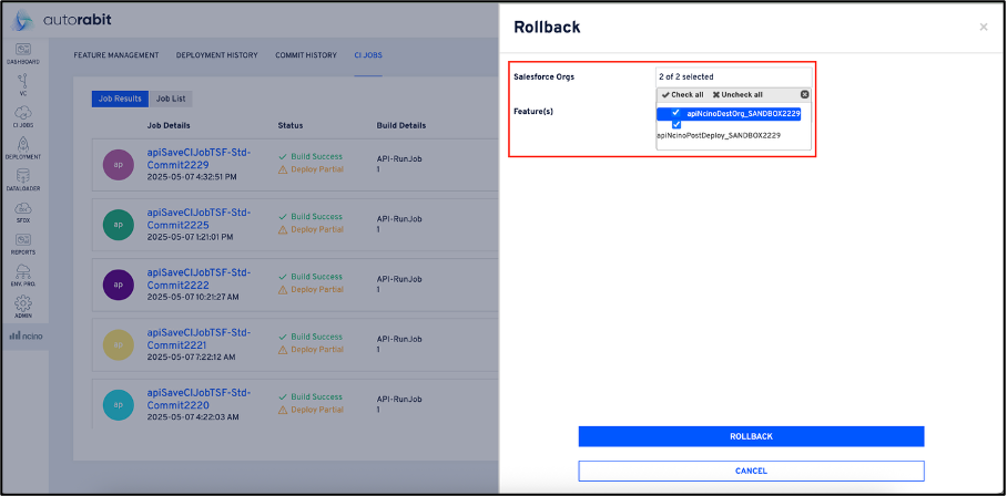 Rollback functionality is now supported for the Orgs selected for post-deployment activities. Please choose the selected Orgs in the highlighted section of the CI job creation flow.