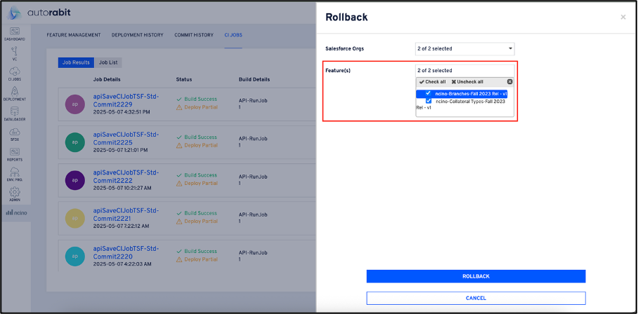 On clicking the Rollback, a window will be displayed with the option to select the feature(s) intended to be rolled back.