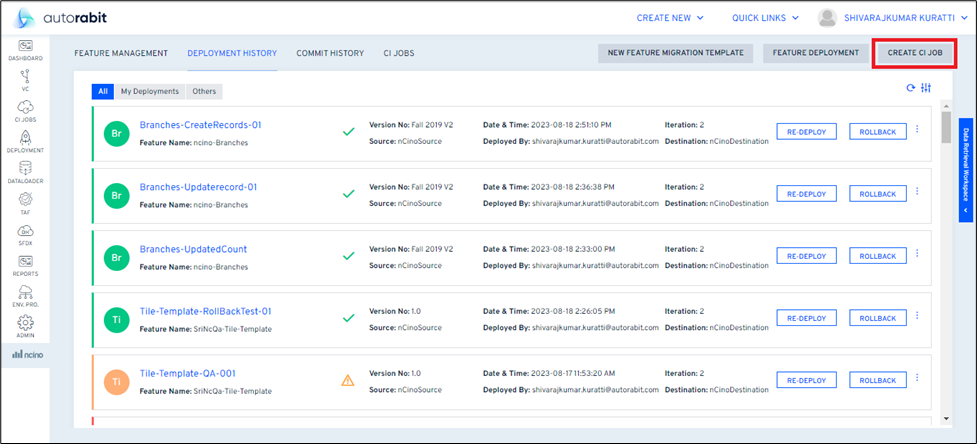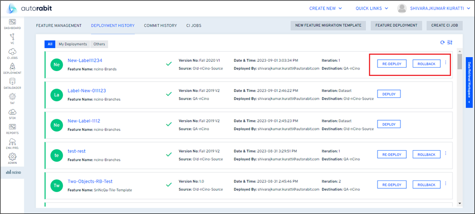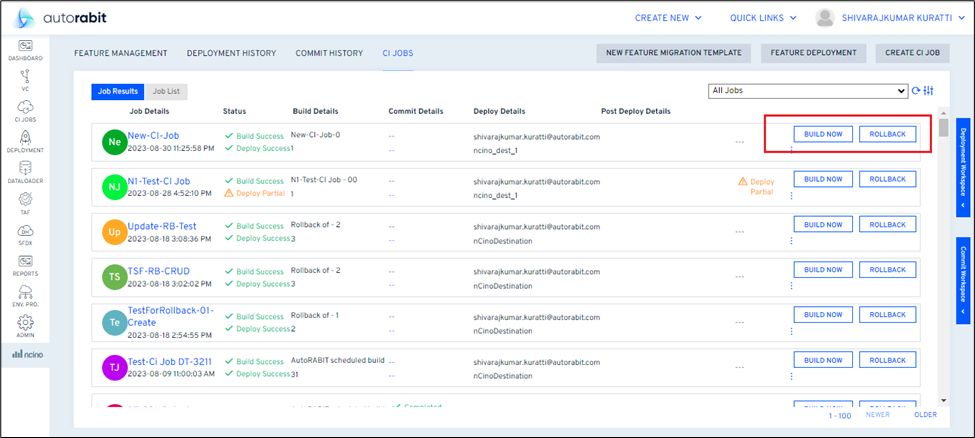 Observe the ‘Rollback’ option, both on the 'Deployment History' page and on the 'Job Details' page.
