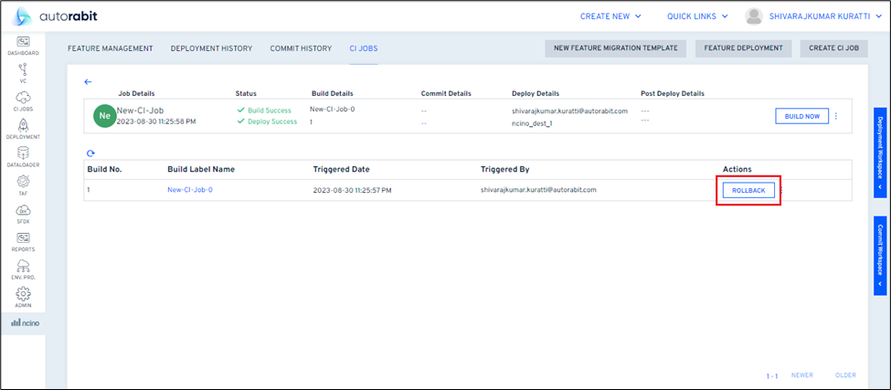 Once the build run is completed, users can see that the 'rollback' button is available on the 'job results' page.