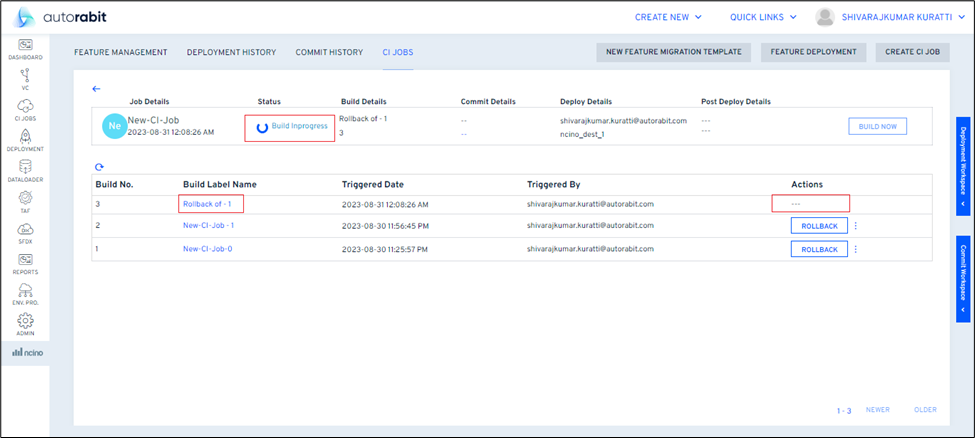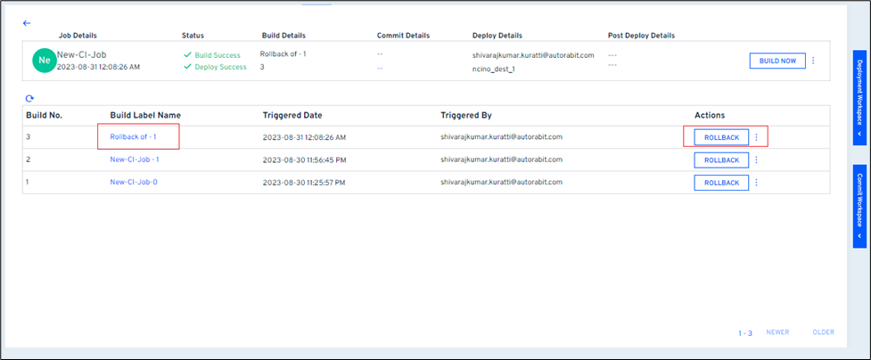 A new build will be added to the list of the build in the following format: 'Rollback' - < Build No >