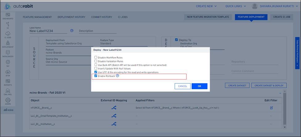 On clicking the 'Create Dataset & Deploy' button, a popup with the 'Enable Rollback' option is displayed.