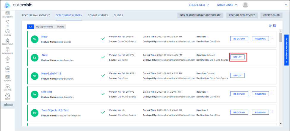 Initiate a 'Feature Deployment' by clicking on the 'Feature Deployment' button.