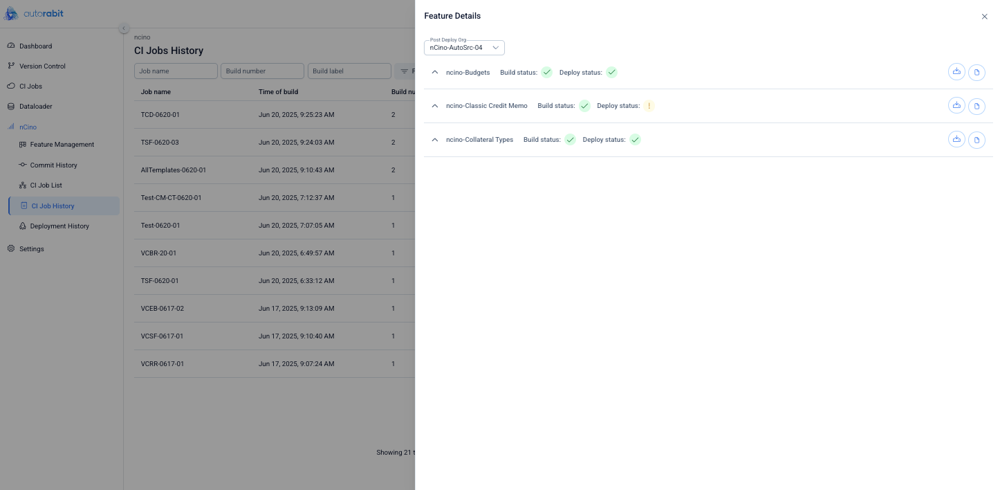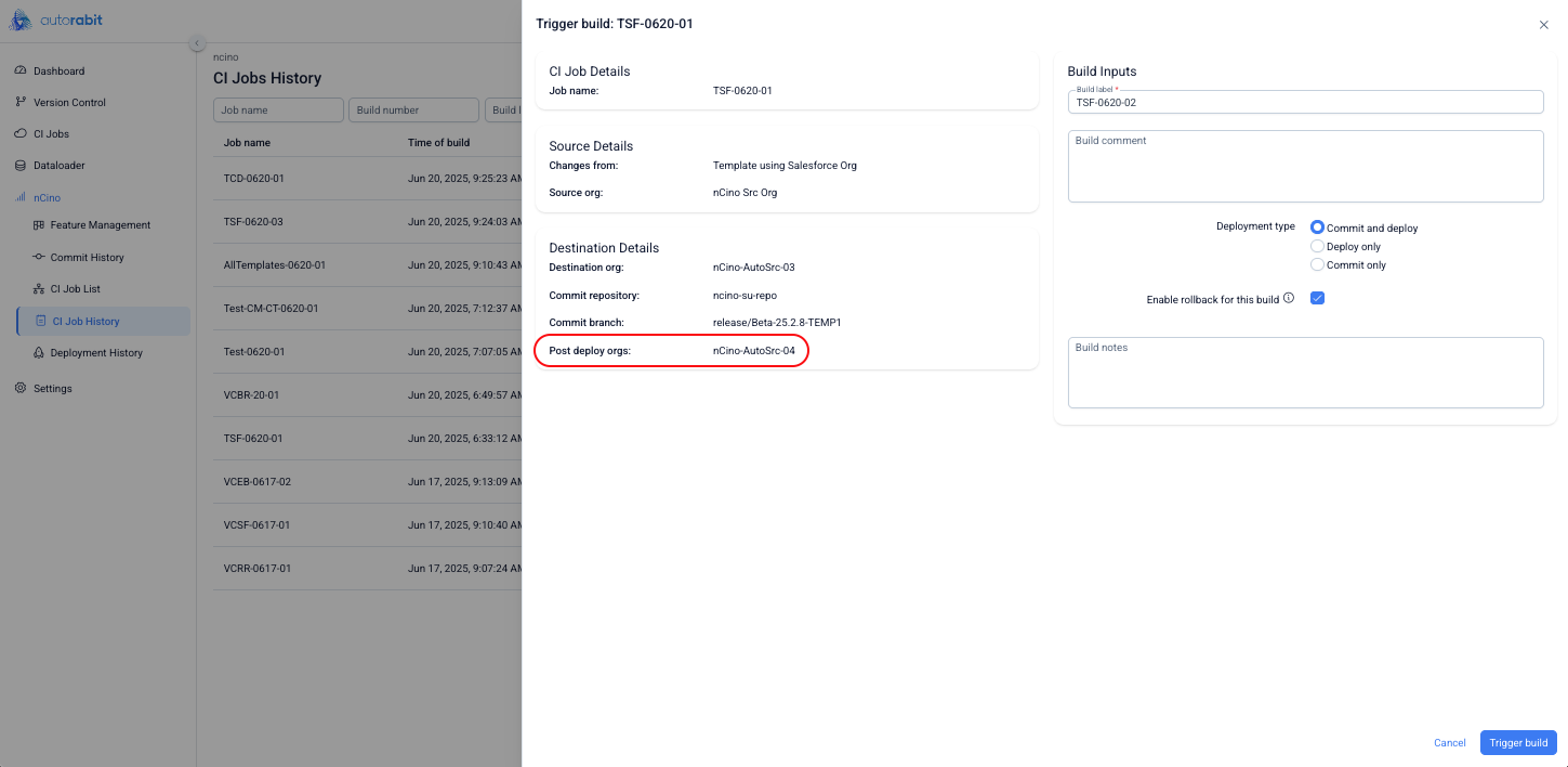 While configuring the CI Job, users can designate up to five target orgs for post-deployment activities. This capability streamlines the deployment process by enabling simultaneous distribution of identical templates across multiple orgs, thereby eliminating the need for separate deployments to each environment.
