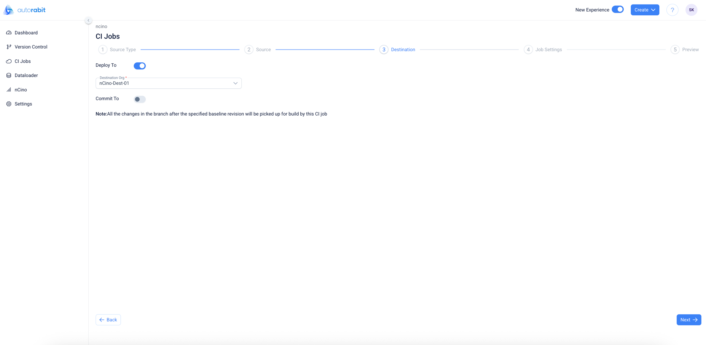 Preview: The final preview screen summarizes source, destination, and job settings, confirming that all commits after the selected baseline revision will be included in the CI job deployment.