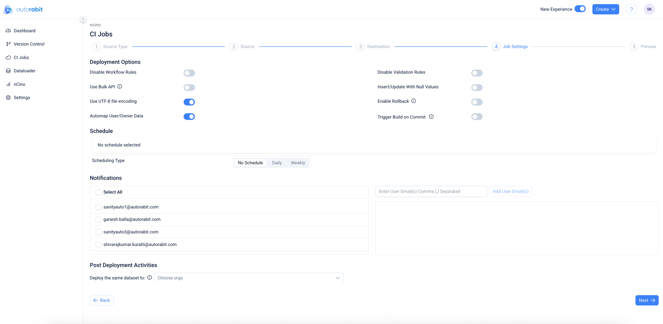 Job Settings: The "Job Settings" screen allows configuration of deployment behaviors, scheduling options, user notifications, and post-deployment dataset propagation in a CI Job.