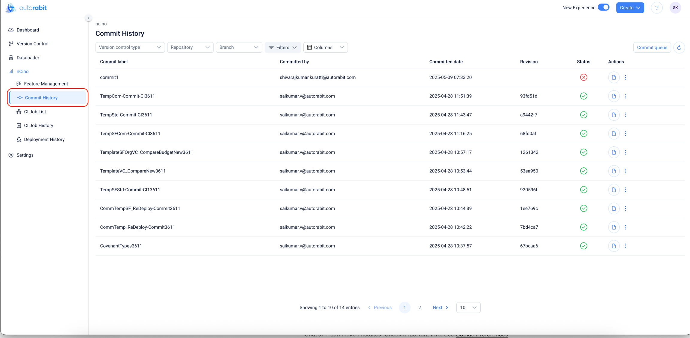 From the left navigation pane under the nCino section, select Commit History to access the commit records.