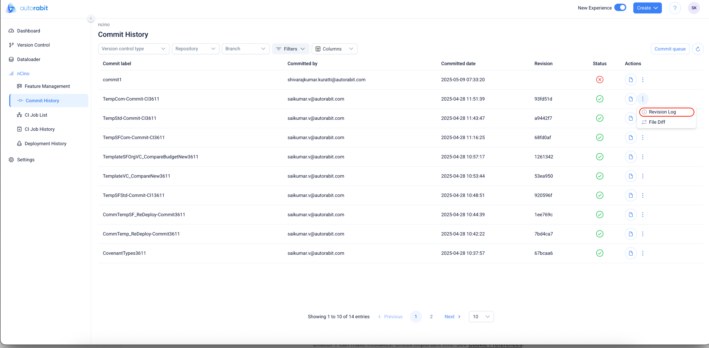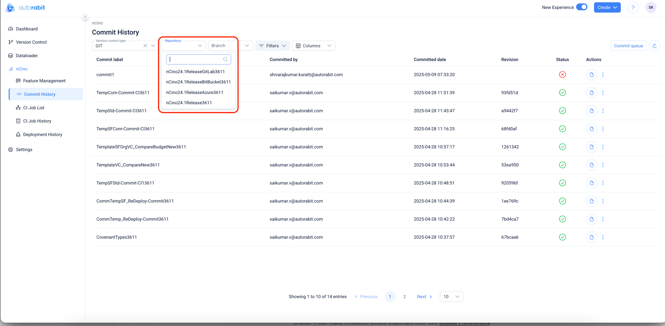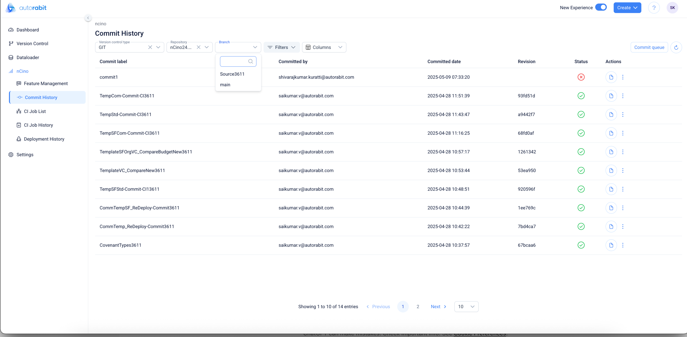 Version Control Integration: At the top of the screen, users can filter commits based on: