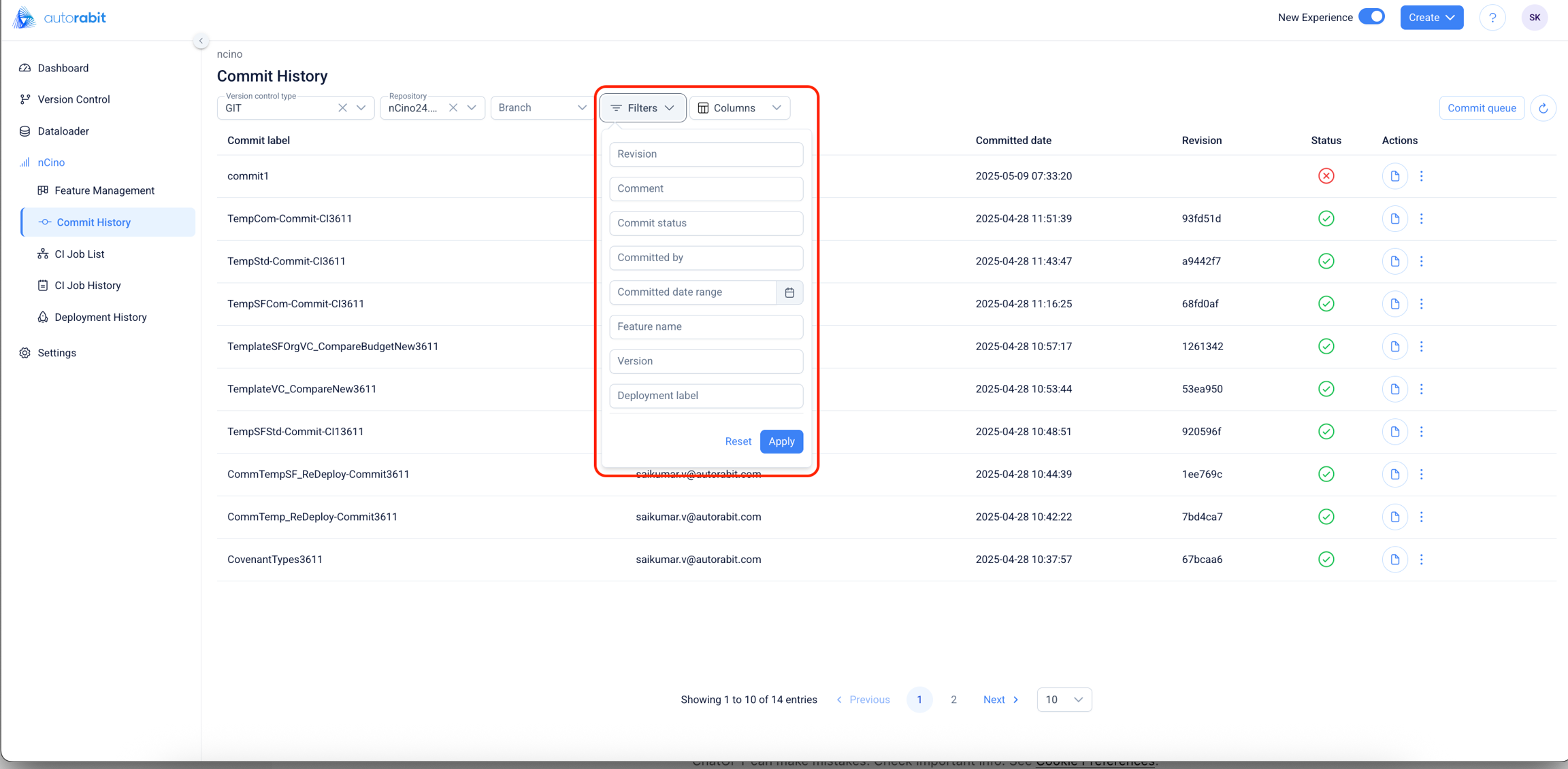Filtering Options: Users can narrow down commit entries using the Filters menu.