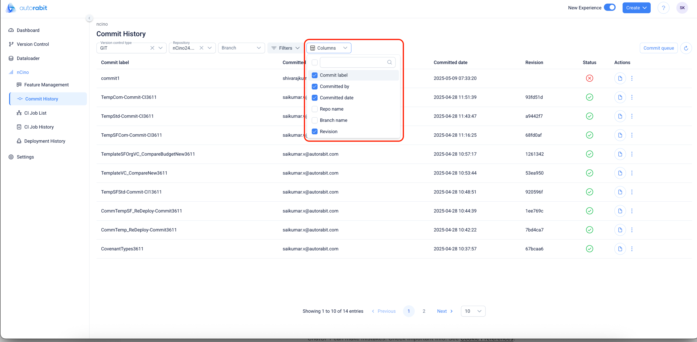 Commit History Table Overview: Each row in the Commit History table corresponds to an individual commit. The table contains the following columns: