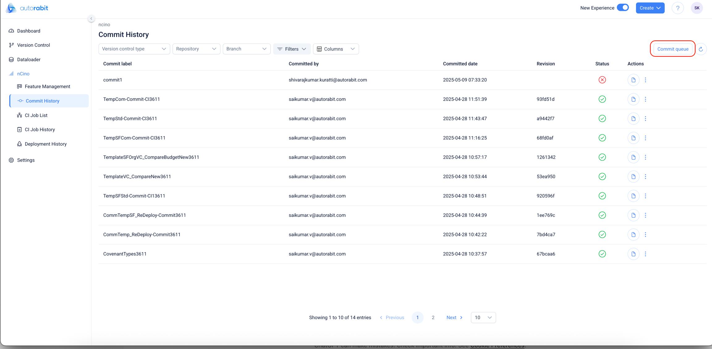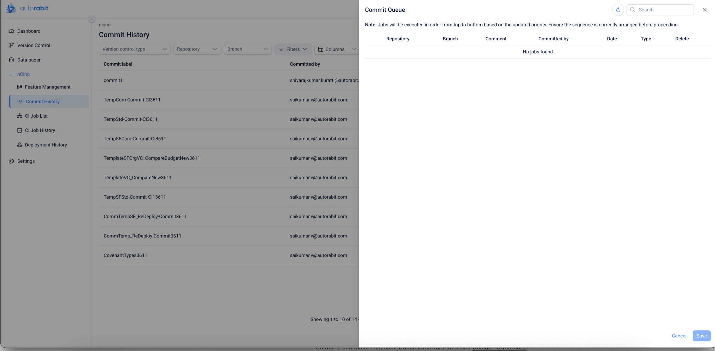 Commit Queue Table: Jobs in the queue can be rearranged based on priority, and execution will follow the defined sequence accordingly.