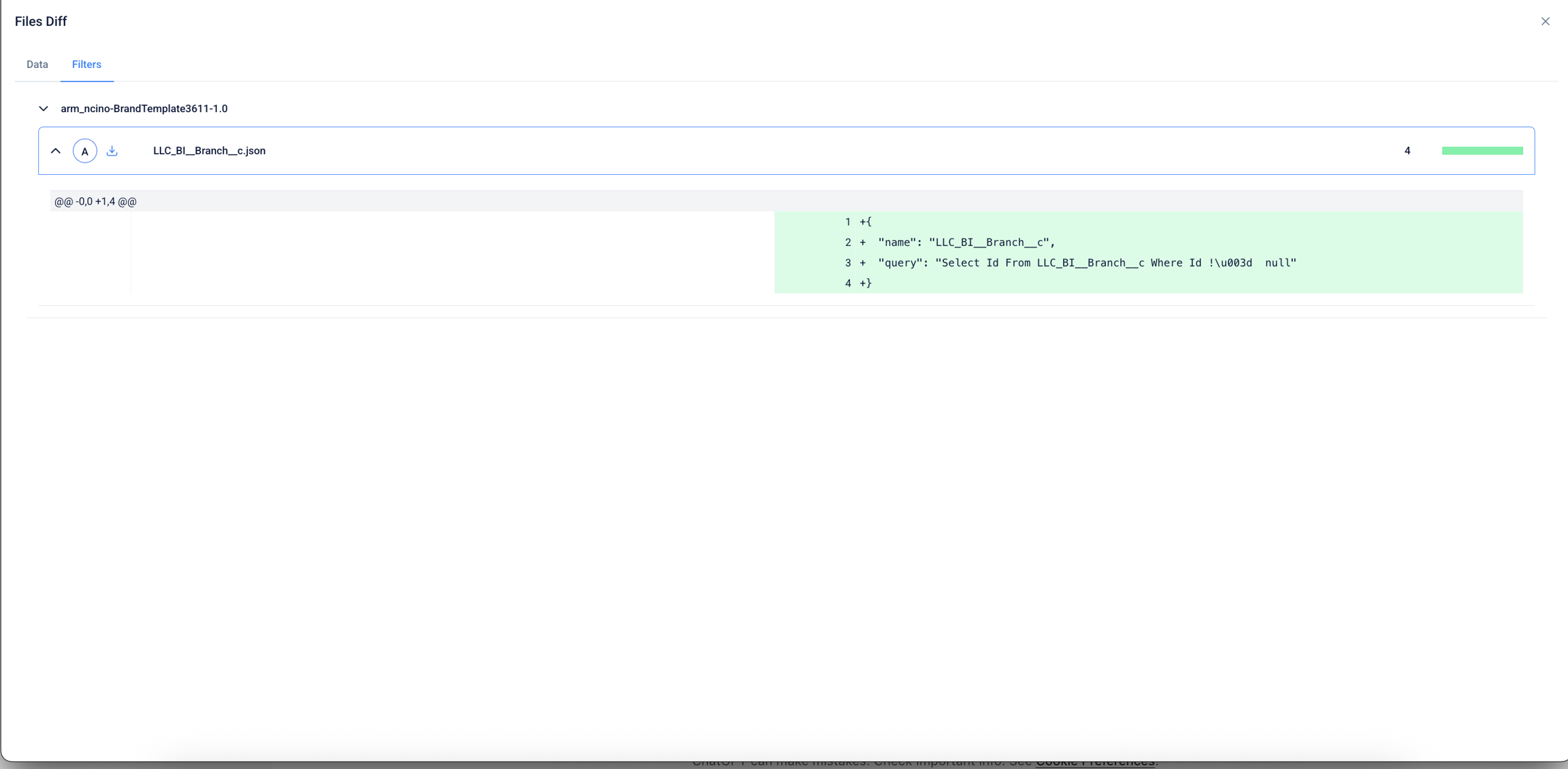 Switching to the Filters tab within the File Diff modal enables the inspection of metadata filters applied during the commit.