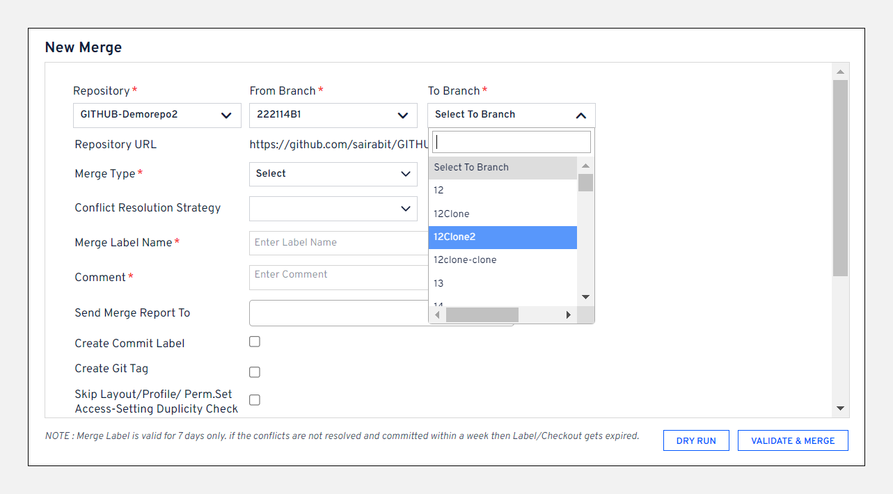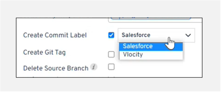 Create Commit Label: To create a commit label for the merge operation, select this checkbox. Choose the Salesforce or Vlocity commit label type from the drop-down menu.