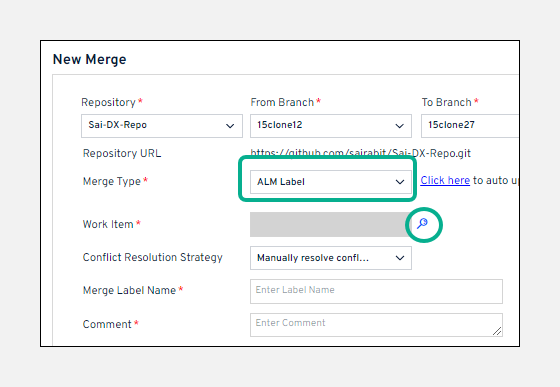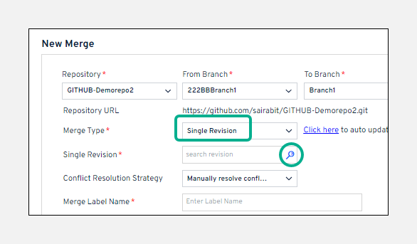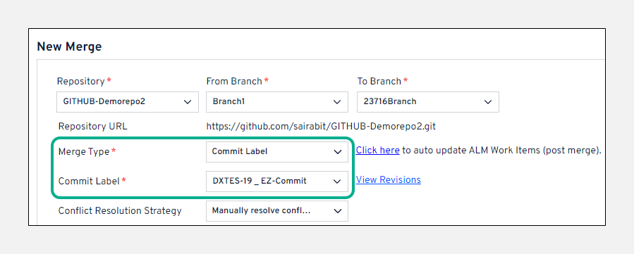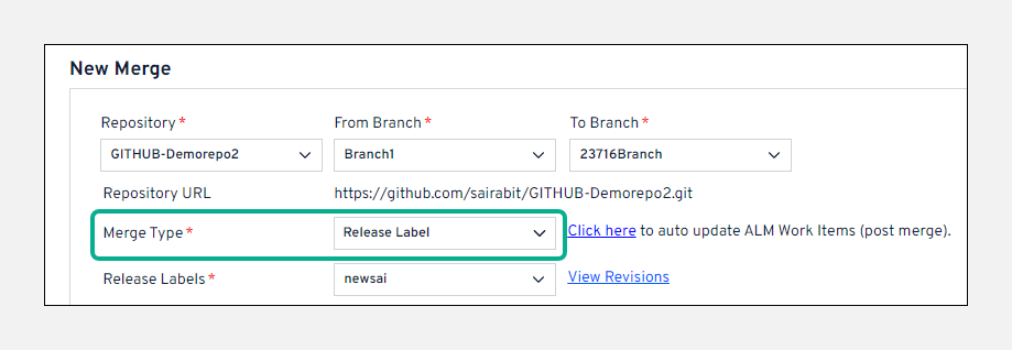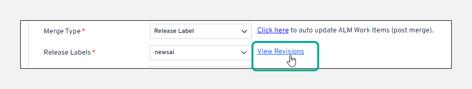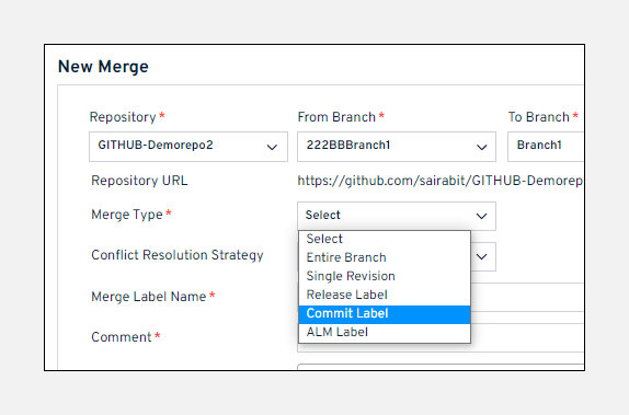 Merge Typefrom the dropdown:Entire BranchSingle RevisionCommit LabelRelease LabelALM Label