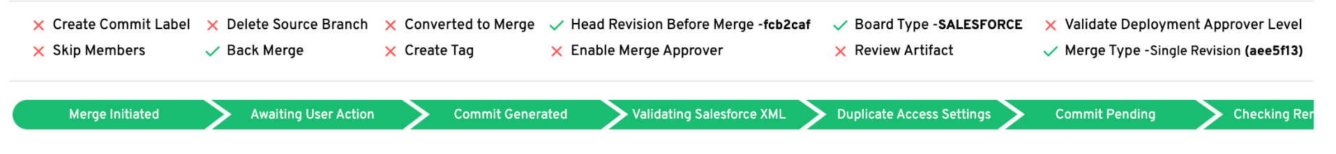 Merge Pre-validation Process (✓ / X): o Description: Performing preliminary checks before the actual merge to identify potential issues. o Success (✓): When the Merge Pre-validation Process returns a green check mark (✓), it signifies that the pre-validation check has been successfully completed. It does not indicate whether or not the process returns errors - only that the process itself has run. To check for errors please refer to logs and validate the deploy. o Failure (X): The appearance of a red cross mark (X) signifies that a process has encountered an issue or has failed to complete successfully.