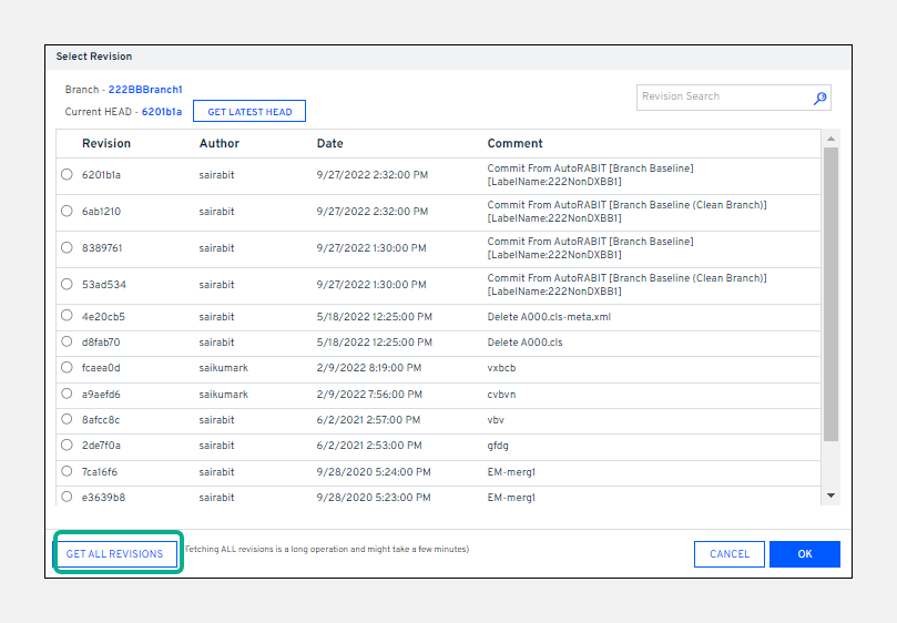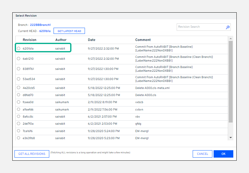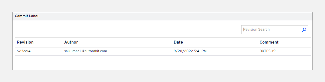 Click on the View Revisions link for the list of revisions associated with the commit label. A new dialog box appears with the revisions, date/time stamp, comments, and author details. There is a provision to search for specific revisions using the Revision Search filter on the top right corner of the dialog box.