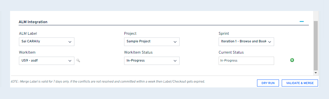 Select the Work Item, and the Current Status for the work item gets auto-populated. This allows you to update the ALM for the Merge operation with or without changing the current work item status. Click on the + icon to add another work item and update its status.