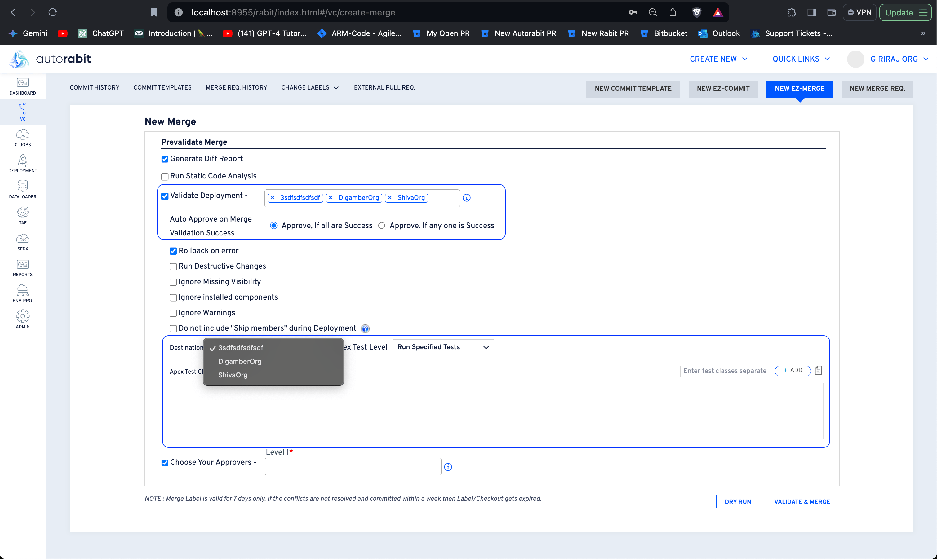 You can now select up to three Salesforce Orgs for deployment validation. This allows for thorough testing across different environments before completing the merge.