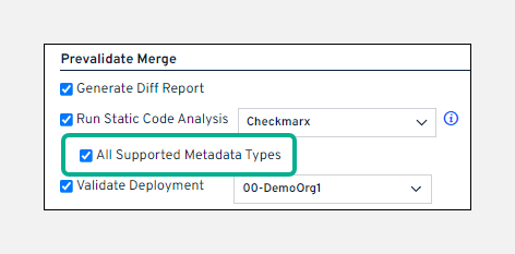 In this section, you can assign certain pre-validation merge operations before merging to your target branch. These operations include deployment validation with up to three selected Salesforce Orgs, choosing Apex test classes to run, selecting the static code analysis tool, and generating difference reports.
