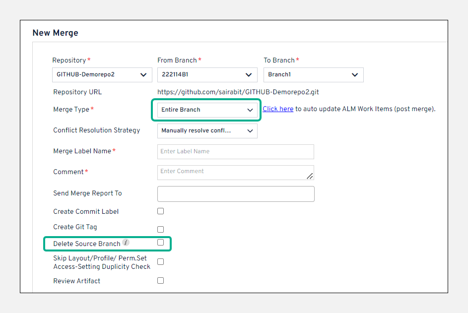 Delete Source Branch:Once you have successfully merged the changes from the source branch to another, you can permanently delete the source branch. Select theDelete Source Branchcheckbox to delete the source branch, which auto-populates whenever 'Entire Branch' as a merge type is selected.