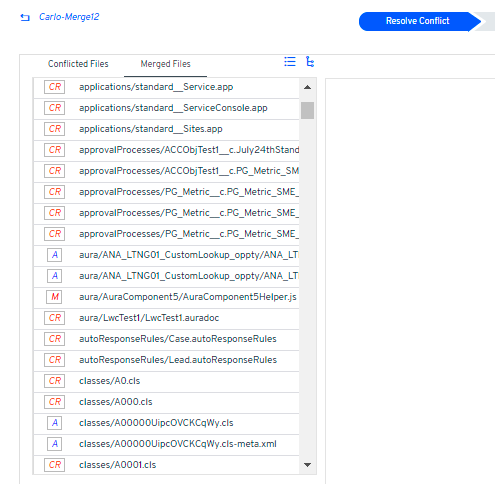 12. You can find the conflicted files moved to the **Merged Files** section. Here **CR** indicates **Conflicted Resolved** file&#x73;**, A** indicates **Added Files** to the destination branch and **M** denotes **Modified Files**.