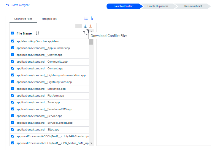 6. Now, select the conflicted files that you want to resolve and click on the **Download** (![](https://1912836914-files.gitbook.io/~/files/v0/b/gitbook-x-prod.appspot.com/o/spaces%2F9vAxMuDrkUkB4OXlH9CL%2Fuploads%2Fs6YozP1nWF5JJBNDrcUT%2Fimage.png?alt=media\&token=8ac831e1-e056-4092-9370-5f11663c283e)) icon.