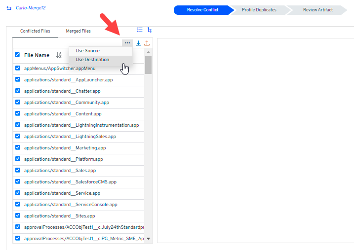 7. To proceed further, select the check box for the respective conflict, click on the **3 dots**, and then select if you want to use the **source** changes or the **destination** changes. Then you can go ahead and proceed with the next step to resolve the conflict.