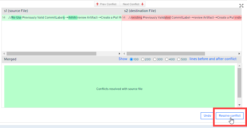 9. **Scenarios when the conflict blocks may not be saved:** The user is working on a conflict block and chooses the appropriate option to resolve it, but before clicking on either **Prev** or **Next Conflict** to autosave the data, the user selects another option, let's say the option to show 100/200/300/400/500 lines before and after the conflict. In such a case, the conflict block data will be automatically erased and the user will need to resolve such conflict block once again.