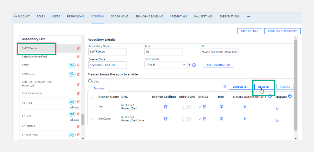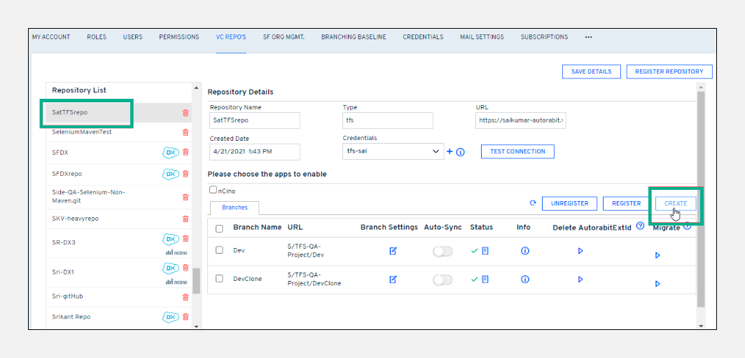 VC Repo'spage, select a TFS repository from theRepository List.Click on