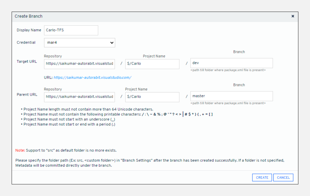 Create Branchscreen, enter a branch name in theDisplay Namefield.Point to Note:The characters "//" \ , * ? & ' " < > | ` ~ ( ) and space are not allowed in theDisplay Namefield.Select your