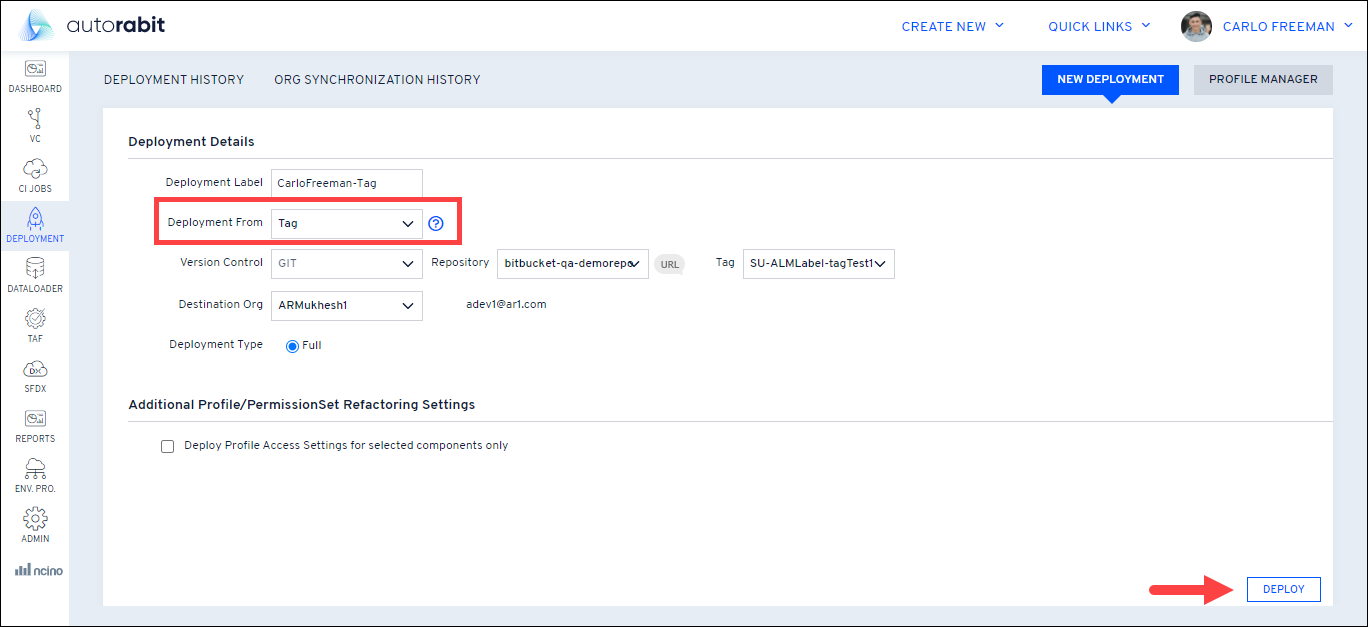 In the New Deployment screen, choose Tag as a dropdown in the Deployment From field.
