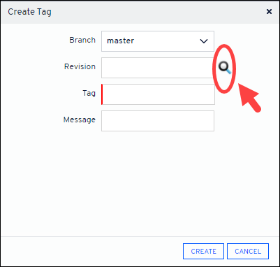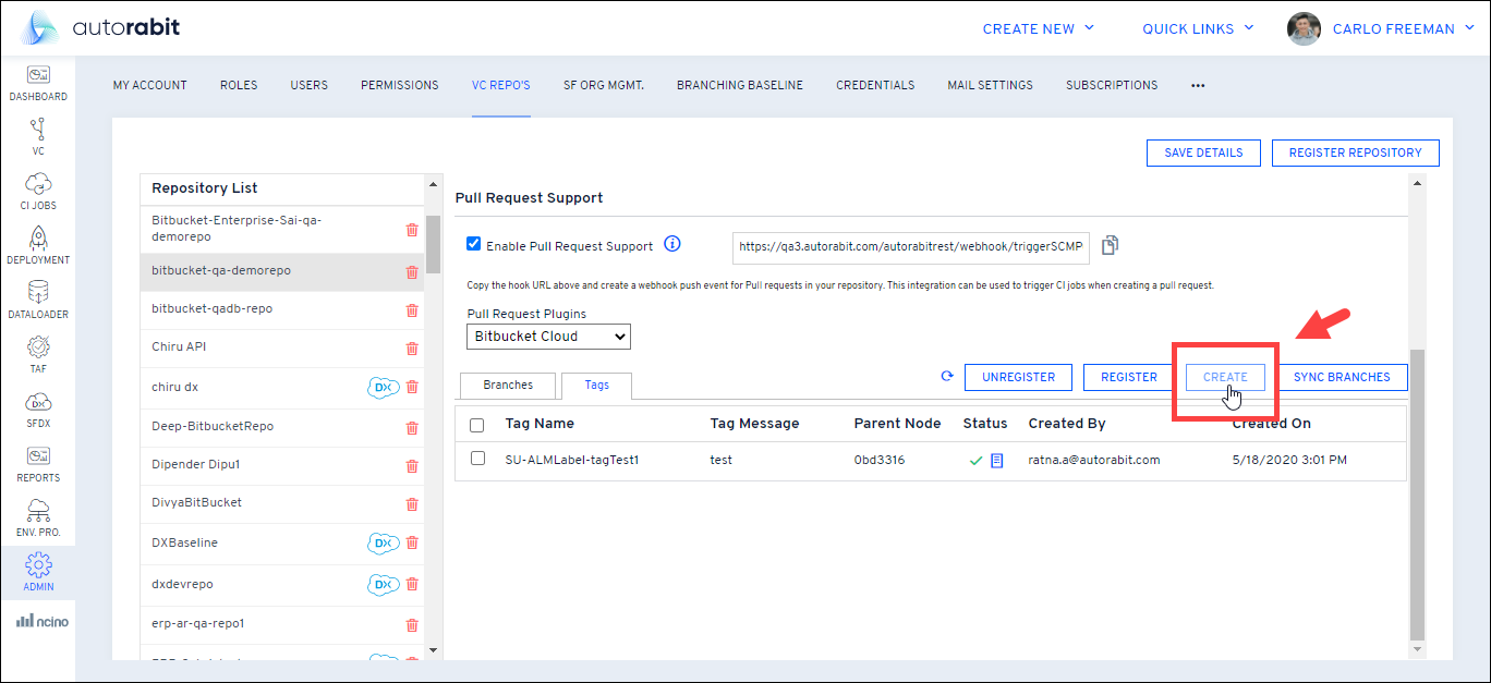 In the Create Tag screen, select the VC branch from the drop-down. The branch that was registered with AutoRABIT for your Version Control repository will be populated here.