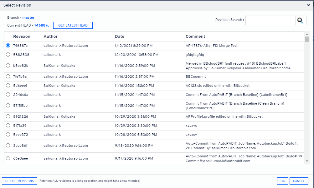 ) button next to the Revision field to pull a list of revisions from which you can choose which revision to use in the deployment.