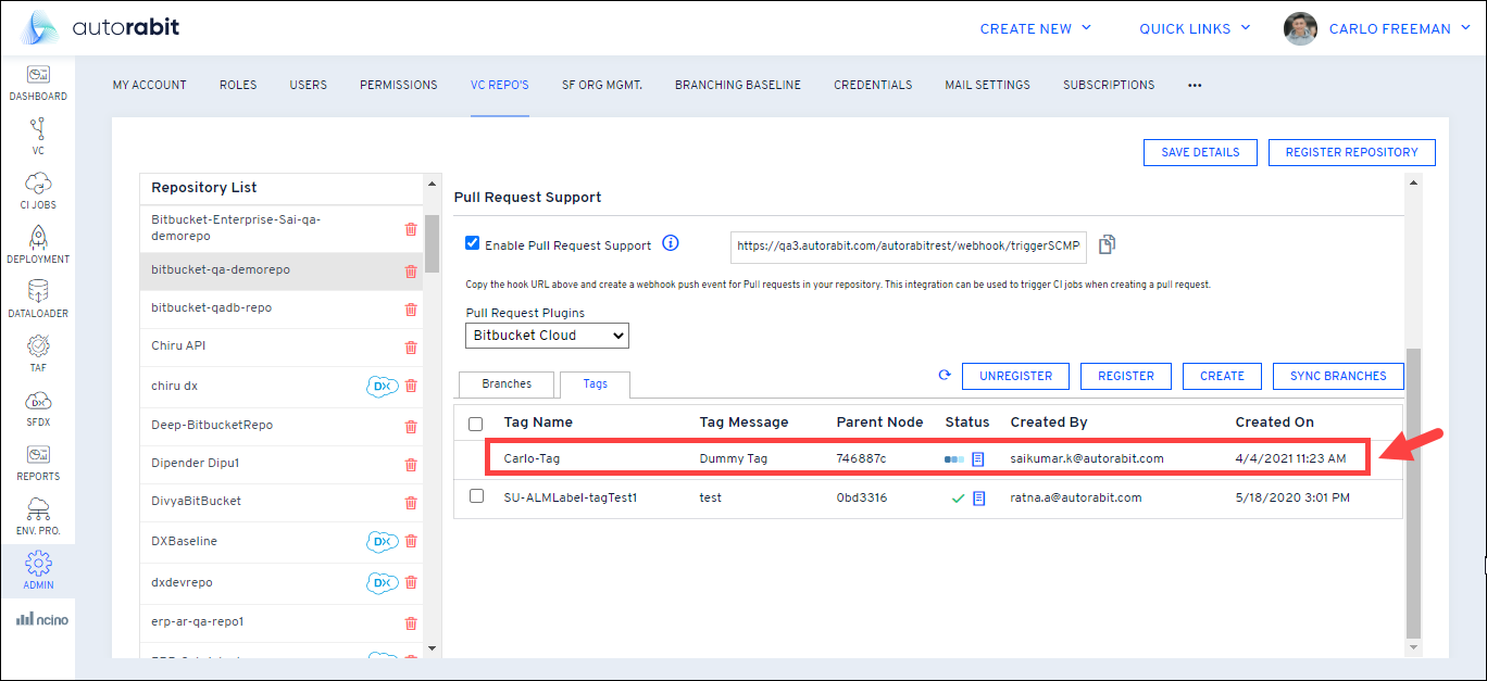Once the merge process is completed and pushed to the remote branch, AutoRABIT will create the GIT tag based on your configuration. To do so,