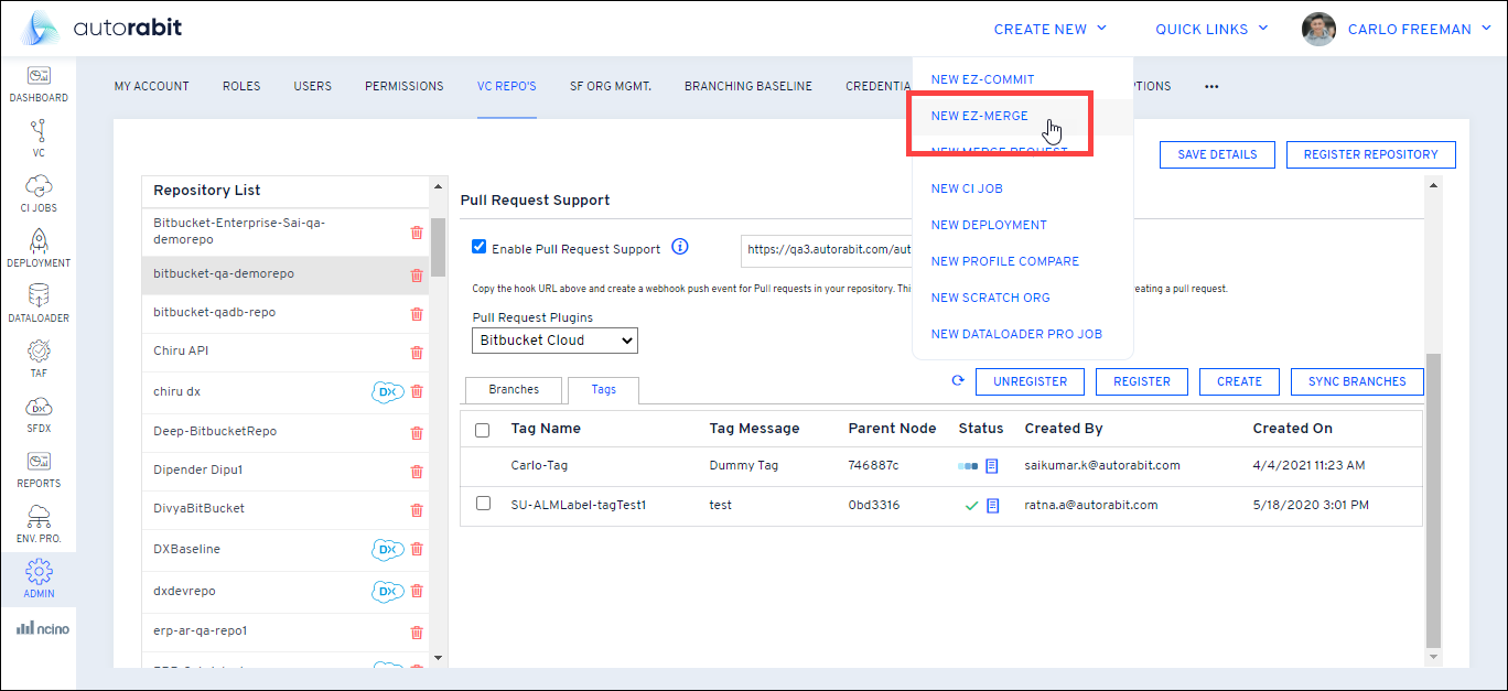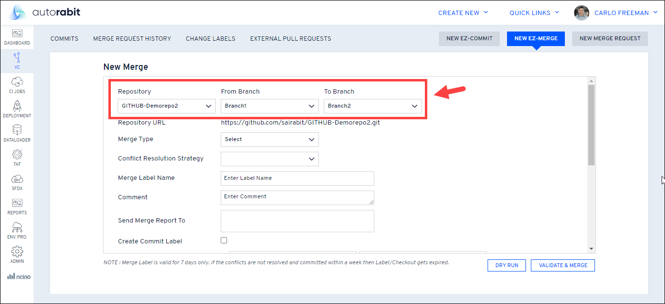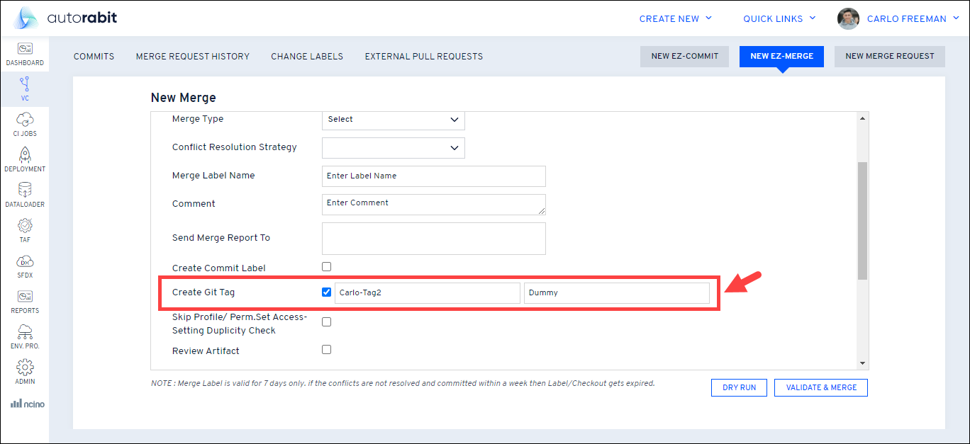 Fill in the remaining fields as per your convenience and click on Merge/ Validate & Merge. Once the merge process is completed, the GIT tag gets auto-created.