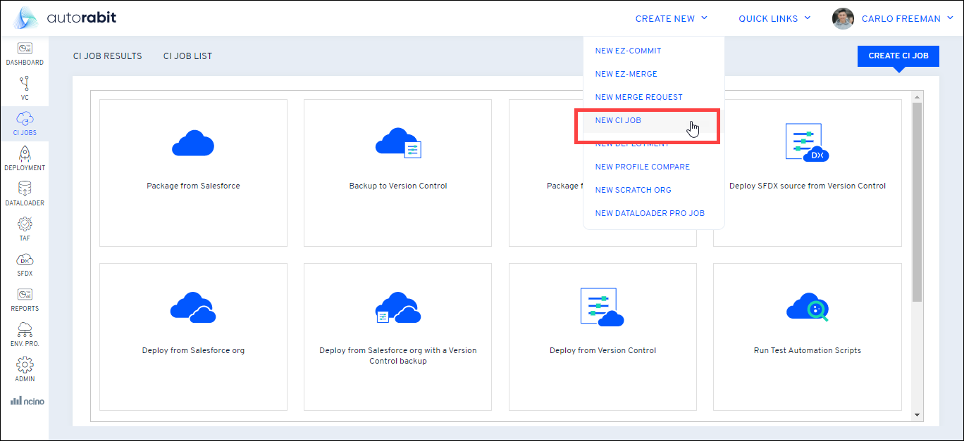 The new CI Job screen gives the job a descriptive name in the CI Job Name field.