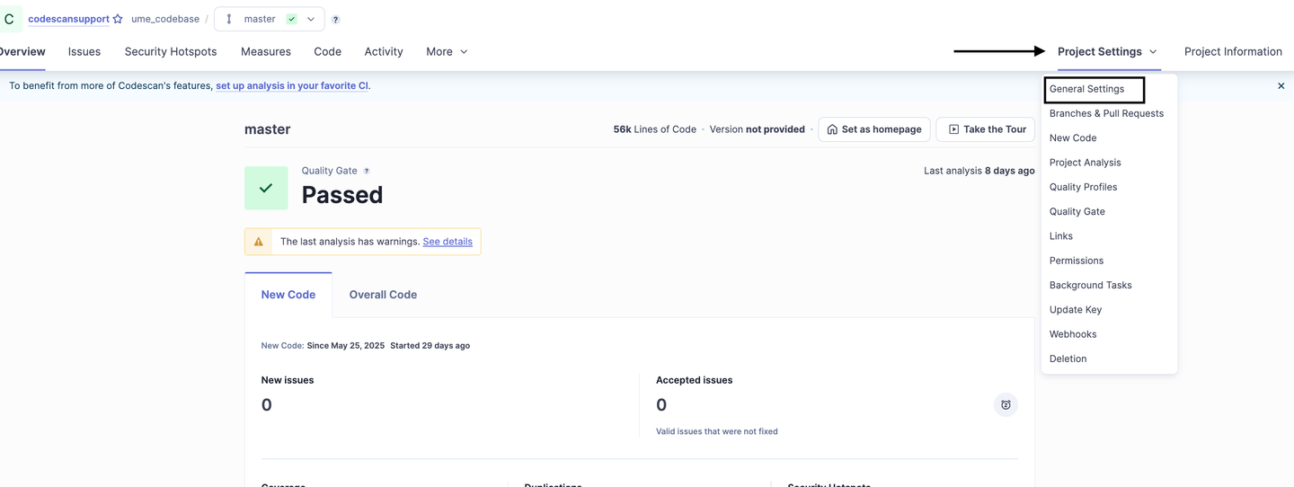 1. Once you are done with the activation of the custom rule, go to the project with the rules you wish to run the analysis and click on **`Project Settings > General settings`**.<br>