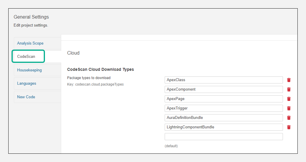 Include your Salesforce metadata types for analysis under the **`Project Settings > General Settings > CodeScan > CodeScan Cloud Download Types`** section for your specific project. Later, add the relevant metadata types' suffixes/extension under the **`Metadata File Suffixes`** section.
