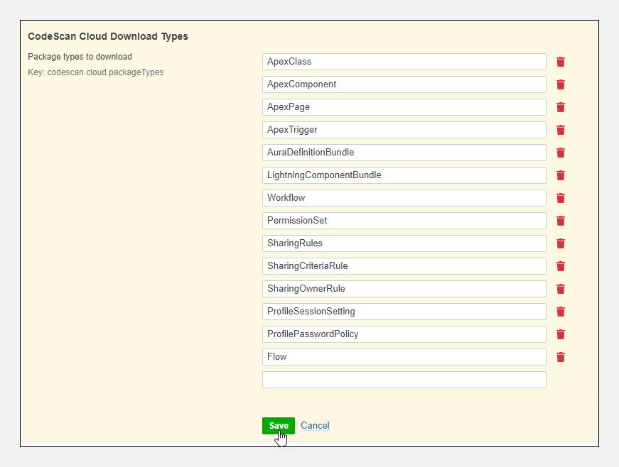 5. Under **`CodeScan Cloud Download Types`**, enter the Salesforce metadata types needed for the analysis, then select the **`Save`** button.