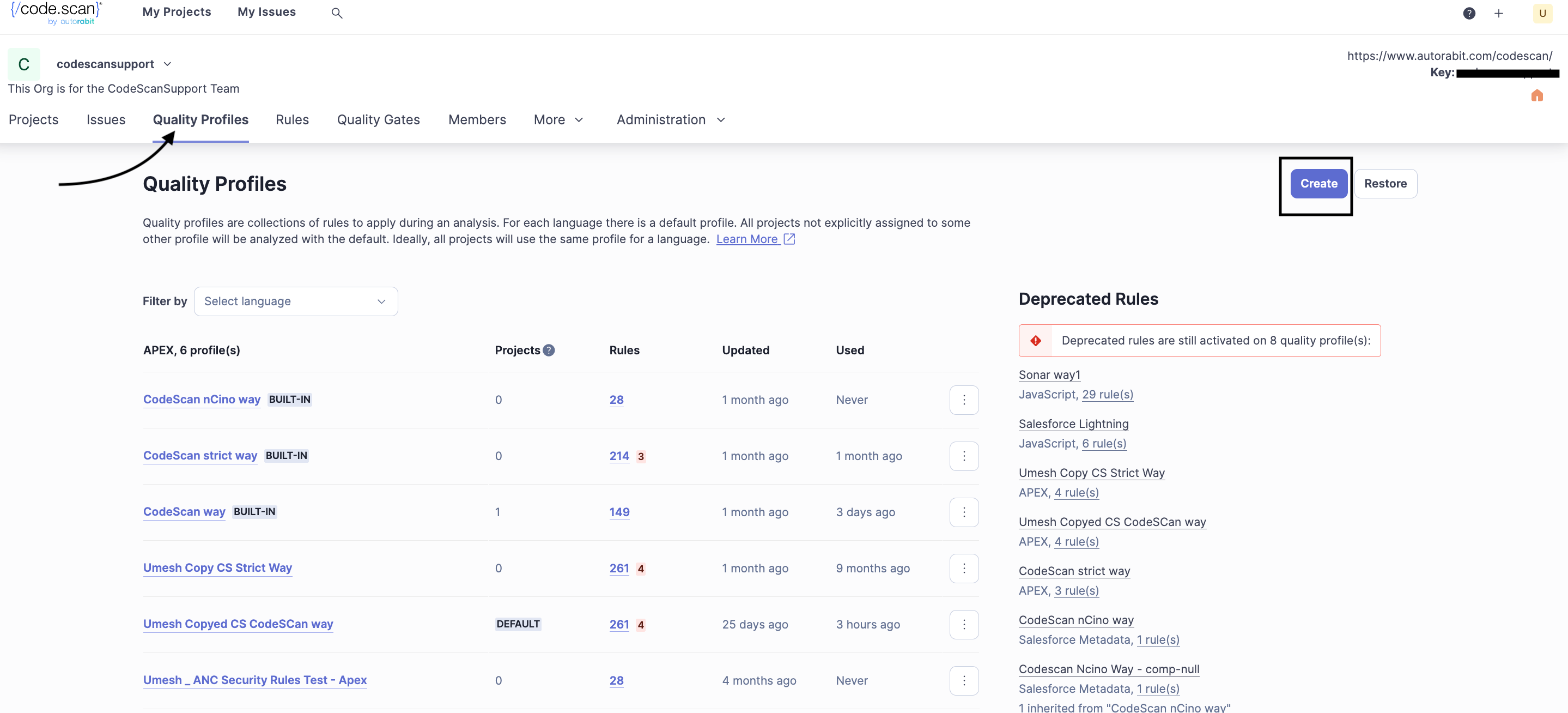 2. Click on the **`Quality Profiles`** on your main organization page and then click on **`Create`** button.<br>