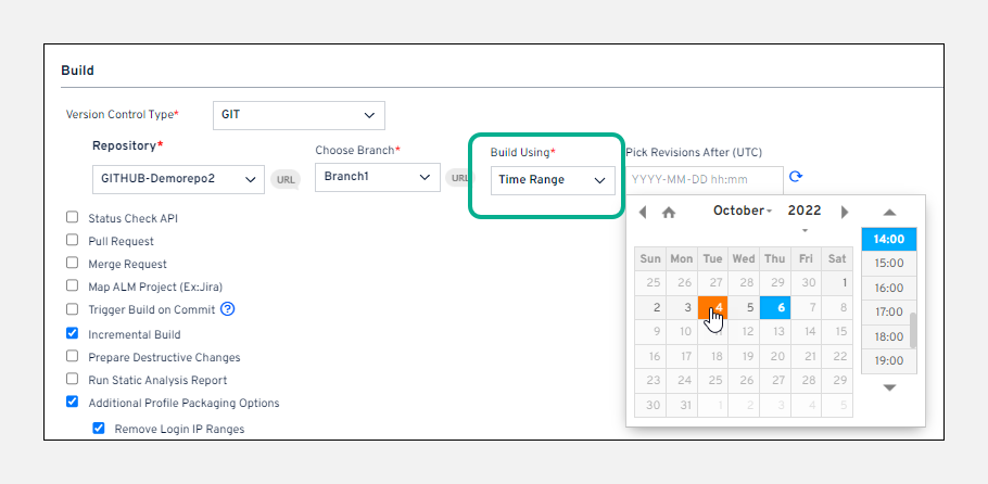 Time Range: This option allows you to create a CI job using a timeline. You need to specify the time period from where the revisions will get fetched. This improves the usability of our CI server and helps build a package based on time rather than commits.