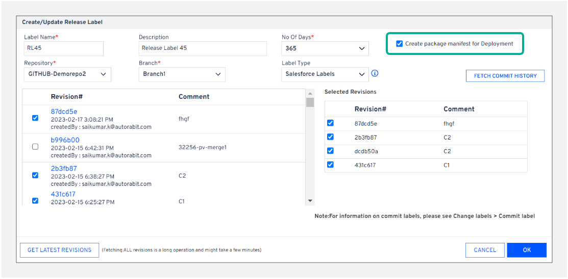No of Daysdropdown list, you can choose to retrieve the commit history for the previous 30, 60, 90, 120, 180, or 365 days or ALL the commits at once. Please note that selecting ALL may result in a slight delay in fetching the entire commit history.You can create a release label and start the artifact preparation immediately by selecting the