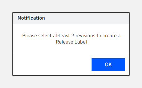 Important Note: If you choose just one revision while creating a new release label, a notification message asks you to select at least two revisions. You can choose the Single Revision option directly from the dropdown on the New Merge screen to perform a merge using only one revision. This helps avoid the creation of unnecessary release labels.