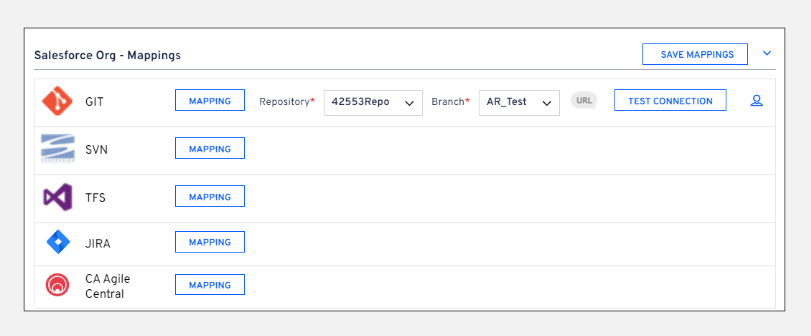 If the admin does not enable Skip Mappings, users must map their respective Version Control repository branch to their Salesforce Org: Go to Admin > Salesforce Org Mgmt > Selected Salesforce Org > Salesforce Org- Mapping, then map the respective branches individually.
