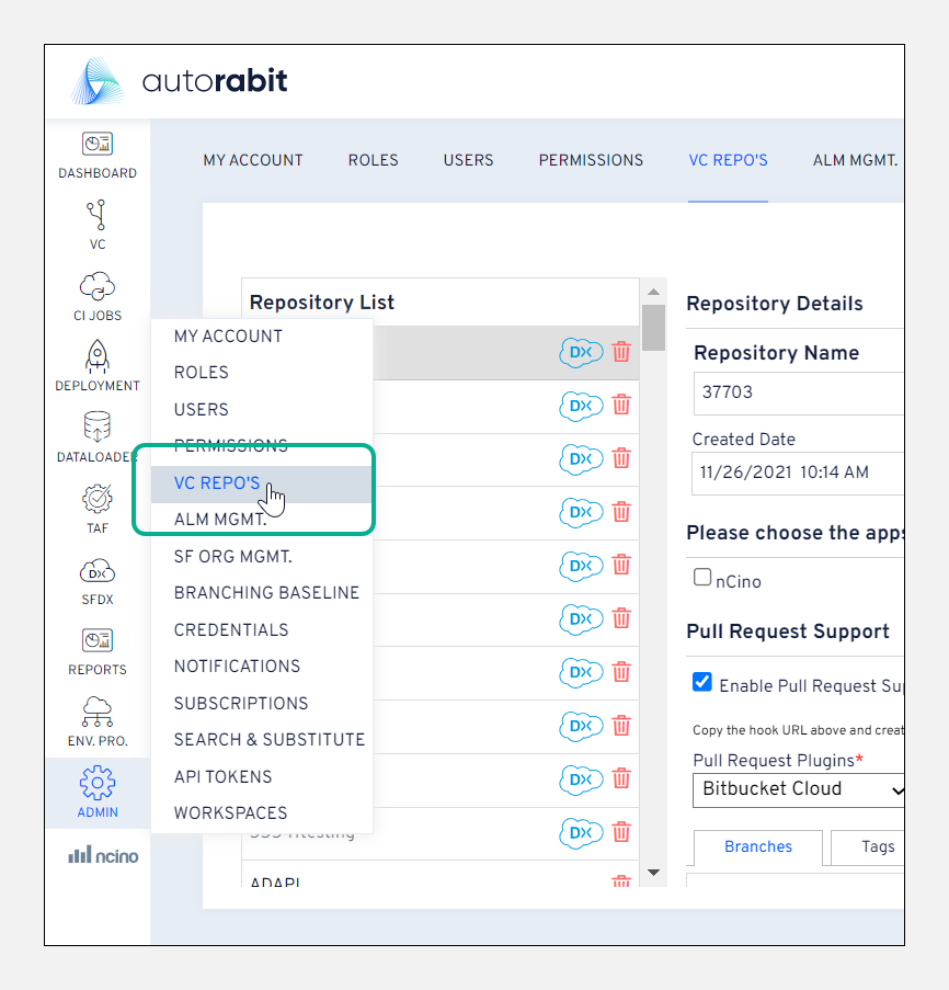 Select a GIT repository for which the branch needs to be created.Note:If your GIT repository is nCino enabled, the nCino logo will be marked in front of your repository.