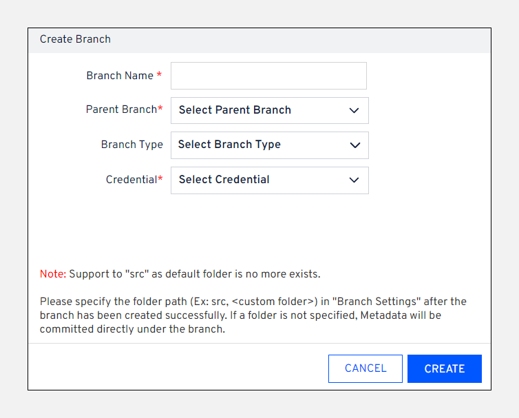 Create Branchscreen, give aBranch nameand selectParent BranchandBranch Typefrom the list. If theParent Branchconfigures a metadata folder path, the same configuration will map to the newly created branch.