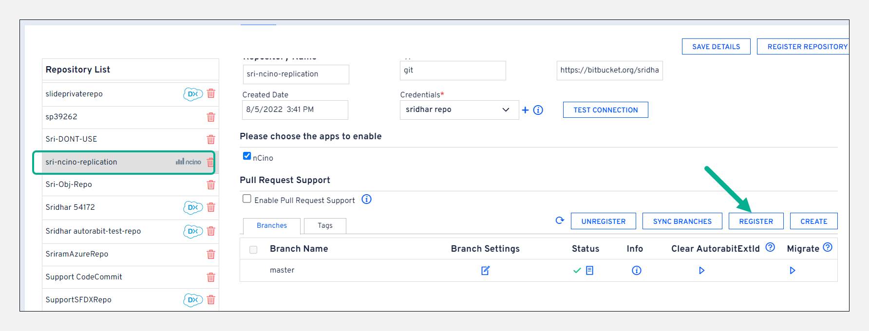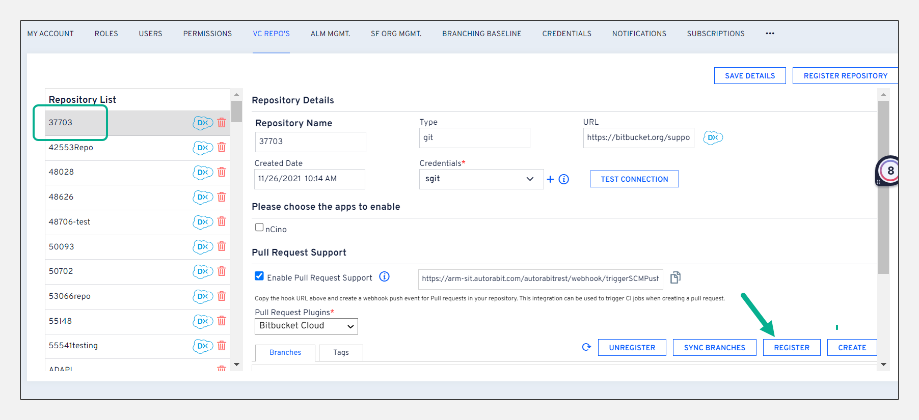Registration of nCino configured GIT branch