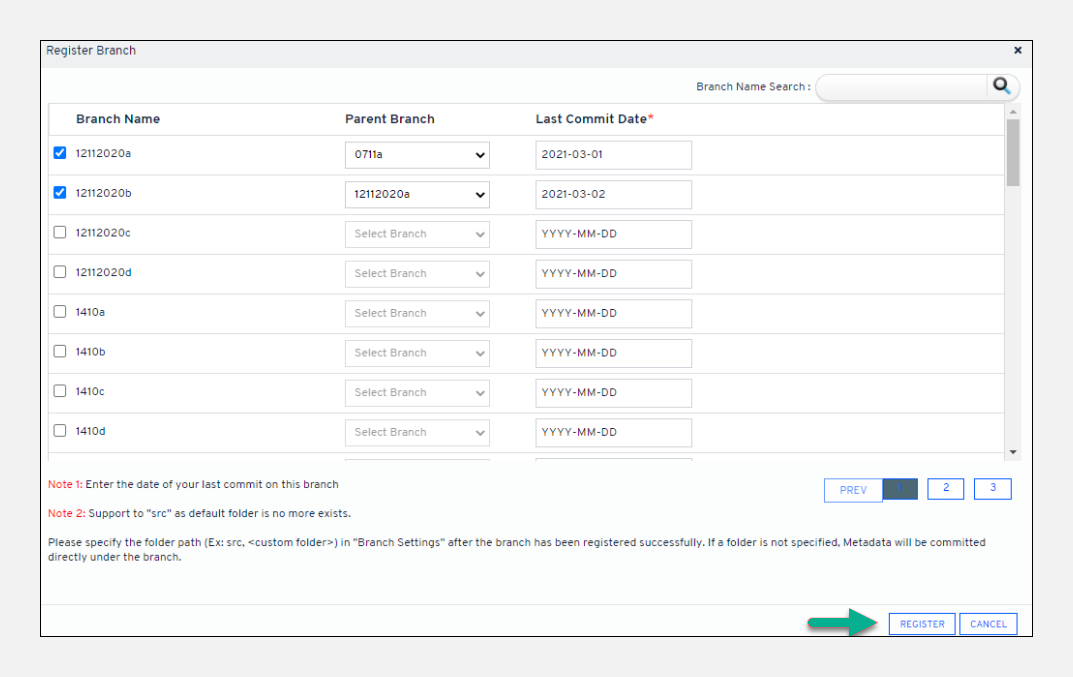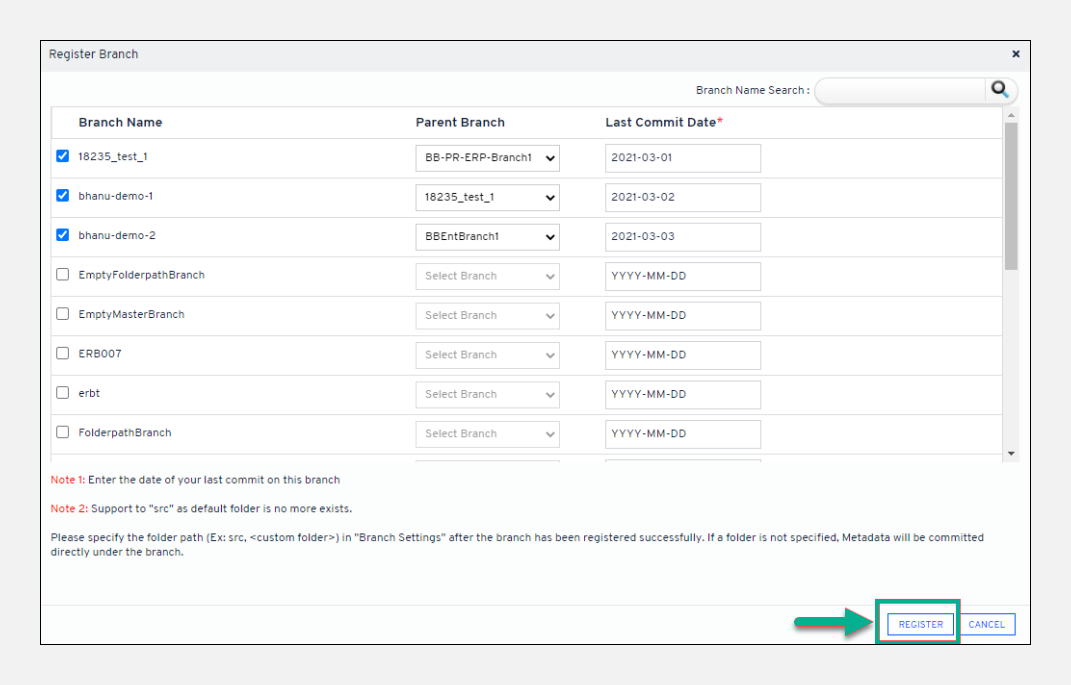 Checkbox the branches you need to register and select its