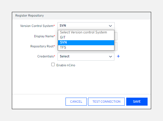 Point to Remember:Select the Enable nCino checkbox to register the SVN repository with nCino objects included. To quickly identify nCino registered Version Control Repositories among all other repositories, nCino logos are marked in front of the Repository Label.