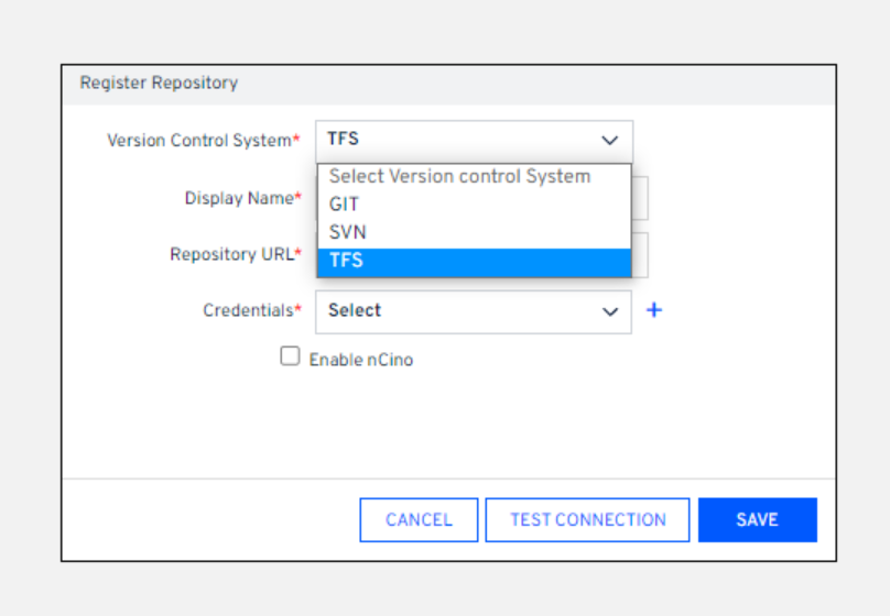 Point to Remember: Select the Enable nCino checkbox to register the TFS repository with nCino objects included. To easily identify nCino registered Version Control Repositories among all other repositories, nCino logos are marked in front of the Repository Label.